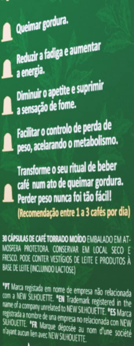 • Texto sobre cápsulas de café torrado moído para queimar gordura com instruções de uso e advertências